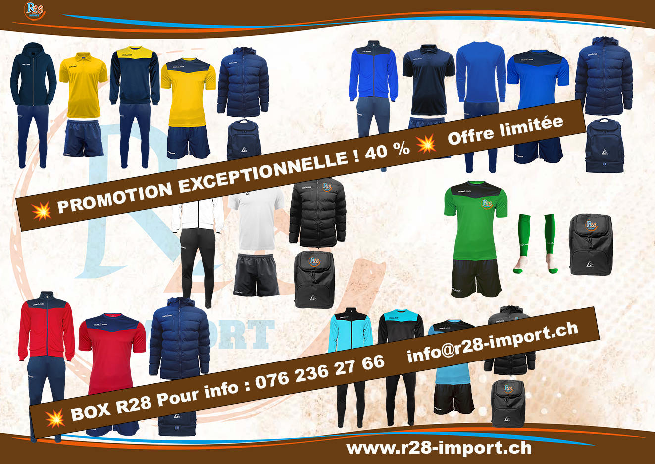 Nous avons le plaisir de vous présenter R28-IMPORT, votre nouvelle référence pour la fourniture de textiles et d’équipements sportifs personnalisables.